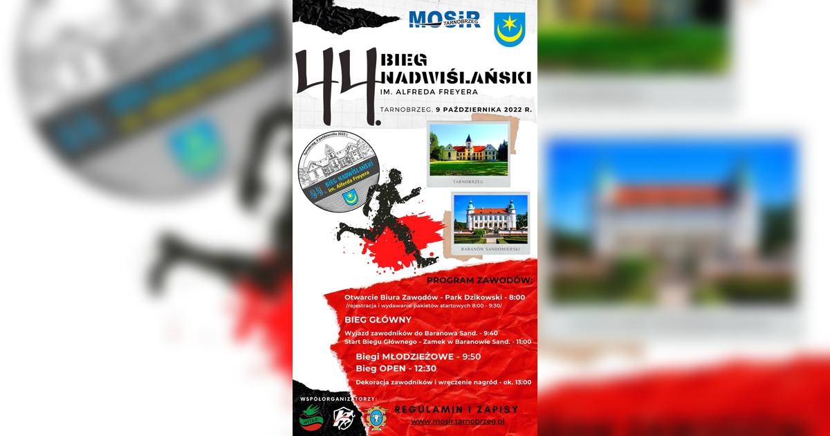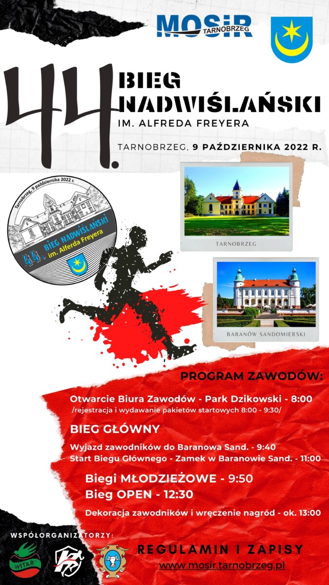 Zapisy na 44. Bieg Nadwiślański im. Alfreda Freyera oficjalnie OTWARTE. Bieg odbędzie się w niedzielę 9 października. Start tradycyjnie usytuowany będzie w bramie Zamku w Baranowie Sandomierskim zaś meta na Zamku Tarnowskich w Tarnobrzeg-Dzikowie.