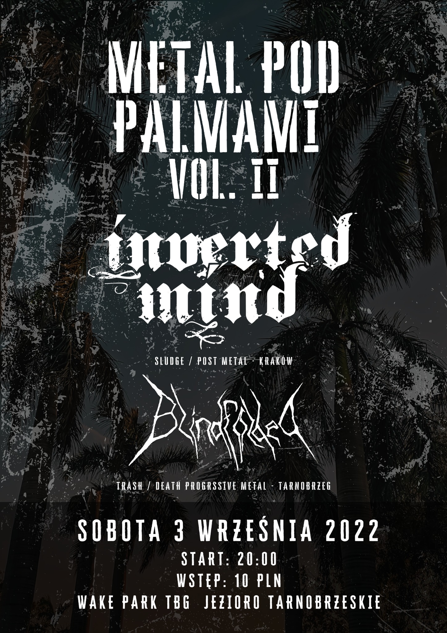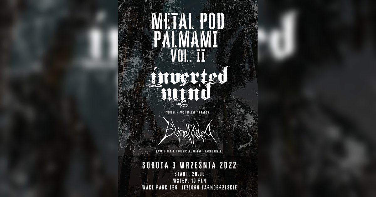 Druga edycja bardzo udanego Metalu Pod Palmami w tarnobrzeskim Wake Parku nad jeziorem. Już w sobotę 3go września wystąpią dla was tarnobrzeski Blindfolded znany z poprzedniej edycji i krakowski Inverted Mind! 🌴🌴🌴