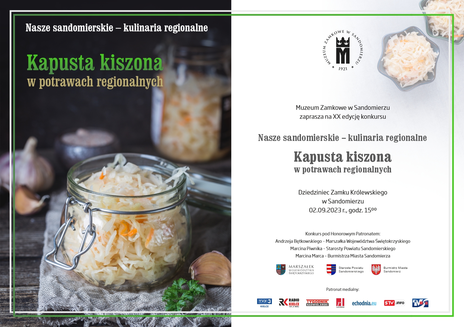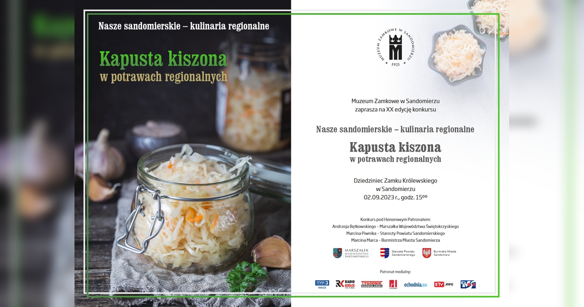 Tegoroczna XX - jubileuszowa edycja konkursu Nasze sandomierskie - kulinaria regionalne zostanie rozstrzygnięta 2 września (sobota) o godz. 15.00, na Dziedzińcu Zamku Królewskiego w Sandomierzu, w siedzibie Muzeum Zamkowego w Sandomierzu. Jak co roku, również i tym razem uczestnikami konkursu będą delegacje miast i gmin powiatu sandomierskiego. Tematem przewodnim spotkania będzie – Kapusta kiszona w potrawach regionalnych. Każda gmina w krótkim publicznym wystąpieniu zaprezentuje przed komisją jurorską oraz zgromadzoną publicznością zgłoszoną do konkursu potrawę. W komisji jurorskiej zasiądą osoby popularyzujące lokalny folklor oraz przedstawiciele branży gastronomicznej, w tym Mateusz Gessler - ceniony polski kucharz, restaurator i osobowość medialna.