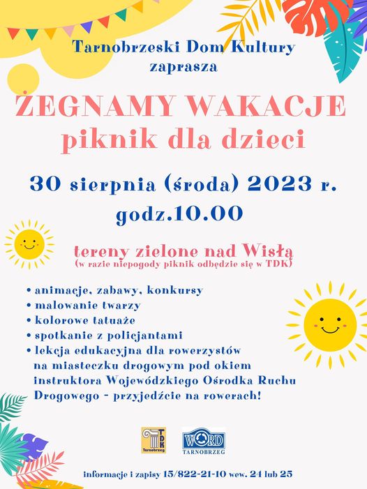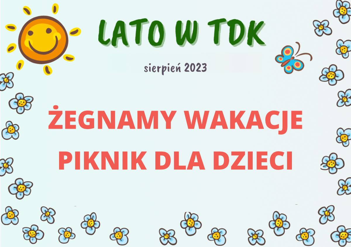 Tradycyjnie letni cykl warsztatów i zajęć w TDK zakończy piknik na świeżym powietrzu. Będzie on podsumowaniem dwóch miesięcy zajęć i spotkań. Nie zabraknie dobrej zabawy, słodkości, konkursów i szaleństw. Piknik zaplanowano na 30 sierpnia.