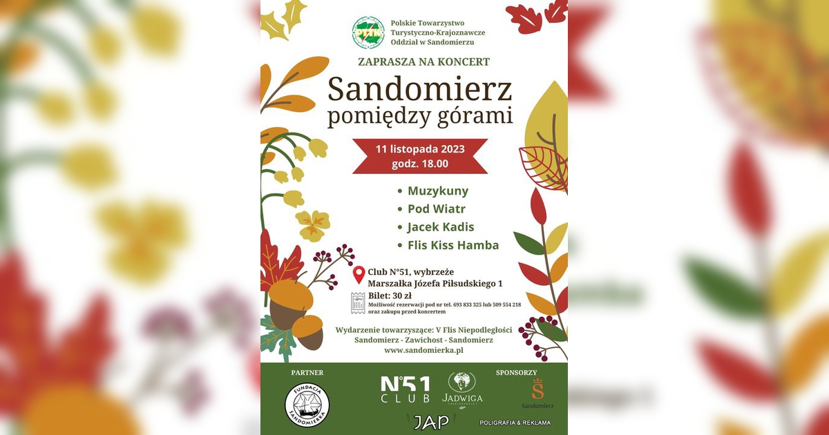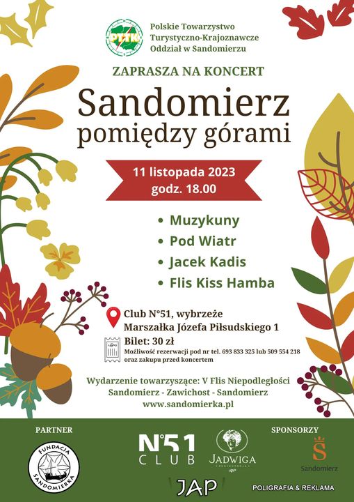 "Sandomierz pomiędzy górami" to spotkanie z muzyką wędrówki, gór i wody. Będzie to prawdziwa uczta Pieśni Wędrowców. Na scenie wystąpią 4 zespoły: Muzykuny, Pod Wiatr, Jacek Kapis oraz Flis Kiss Hamba.