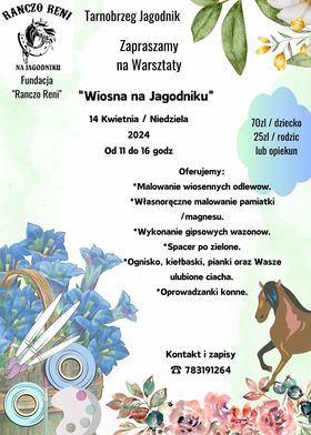 Wydarzenie odbędzie się 14 Kwietnia w Niedzielę od godz. 11 do 16. W programie znajduje się malowanie wiosennych odlewów, wiosenne malowanie pamiątek i magnesów, wykonywanie gipsowych wazonów, spacery po zielone, ognisko, kiełbaski, piknik oraz Wasze ulubione ciacha, oraz oprowadzanki konne.