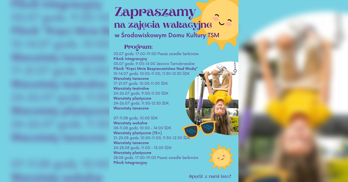 Poniżej na plakacie pełen program zajęć wakacyjnych dla dzieci od Środowiskowego Domu Kultury zorganizowanych w czasie wakacji.